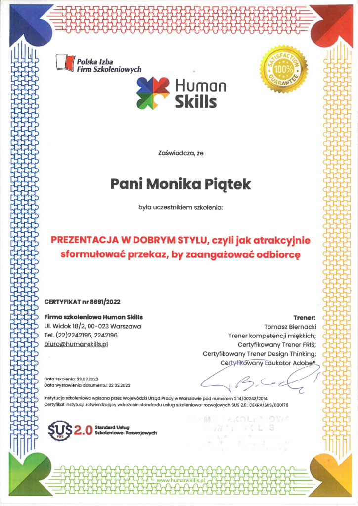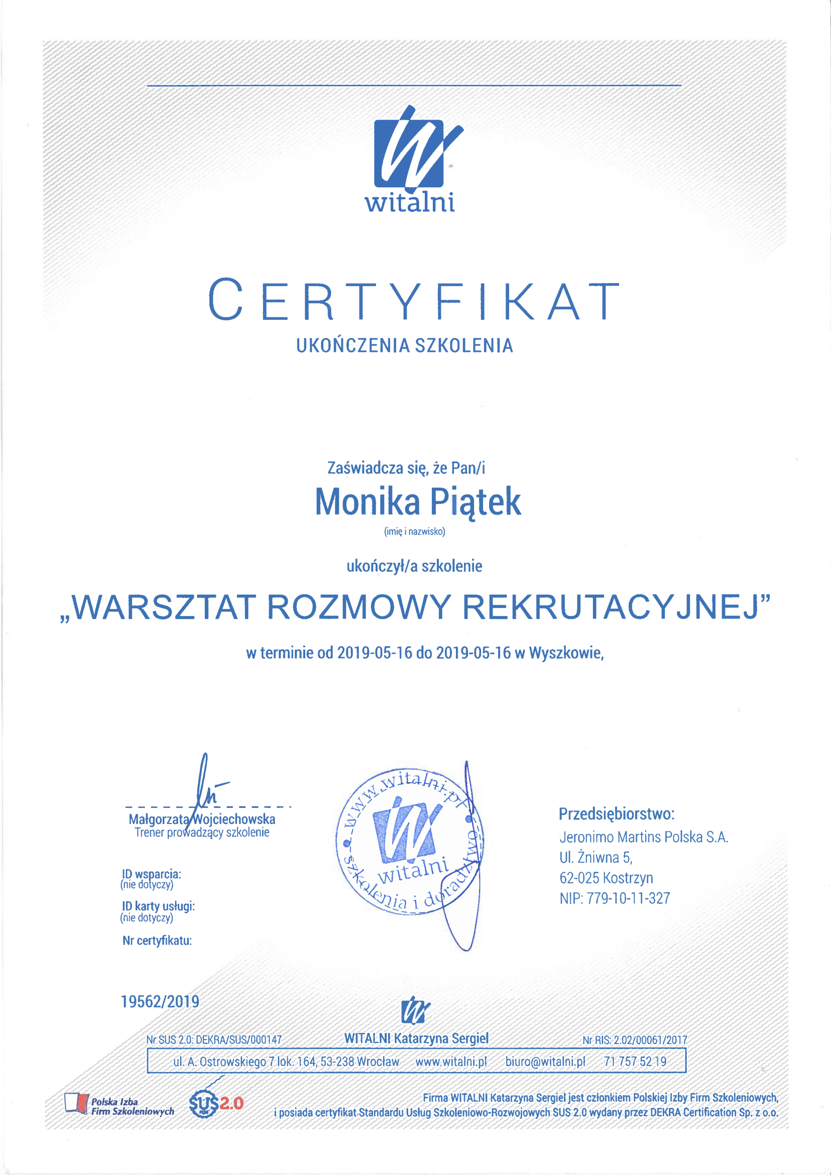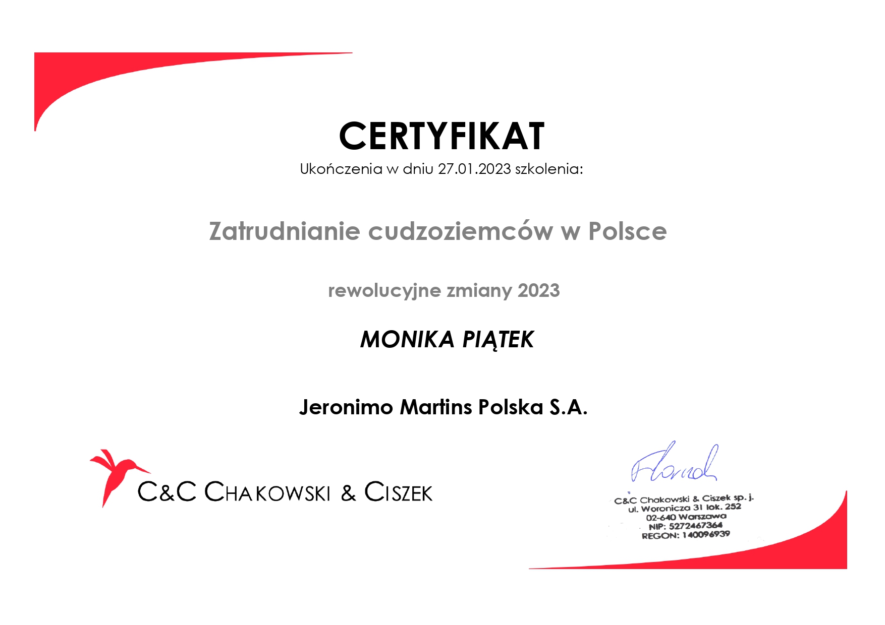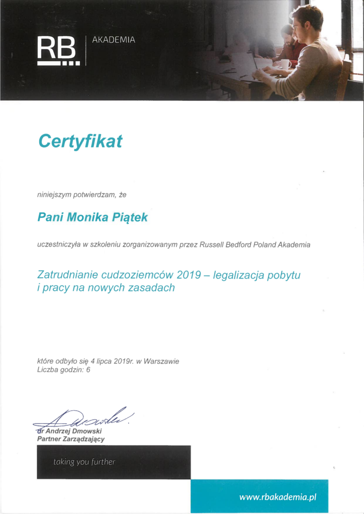 Nazywam się Monika Piątek. Od 10 lat działam na rynku pracy w branży HR, a dokładnie zajmuję się tematyką zatrudniania cudzoziemców. Swoją karierę zawodową zaczynałam na stażu w Wydziale Spraw Cudzoziemców w Mazowieckim Urzędzie Wojewódzkim. Tam poznałam tajniki pracy z dokumentami cudzoziemców tak, aby ich pobyt i praca na terytorium RP były legalne. Dziś jestem ekspertką w dziedzinie zatrudniania cudzoziemców na polskim rynku pracy. Współpracuję z przedsiębiorcami z różnych branż. Dzięki wiedzy, którą nabyłam przez te 10 lat jestem praktykiem, który wspiera pracodawców w tej jakże ważnej dziedzinie HR. Swoje doświadczenie zdobyłam we współpracy z przedsiębiorcami z Polsko-Ukraińskiej Izby Gospodarczej oraz w pracy na stanowisku koordynatora ds. rekrutacji cudzoziemców w Jeronimo Martins Polska S.A. Przez te wszystkie lata jestem odpowiedzialna za przygotowanie pełnej dokumentacji do zatrudnienia obcokrajowca u danego przedsiębiorcy.