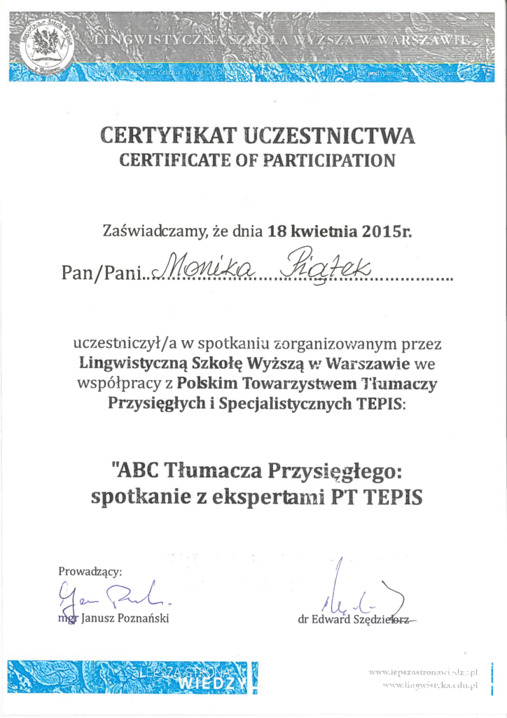 Z wykształcenia jestem filologiem ukraińskim. Znam i posługuję się językiem ukraińskim co w dzisiejszych czasach jest na wagę złota. Jestem tłumaczem języka ukraińskiego. Obecnie jestem studentką studiów MBA w zakresie zarządzania i marketingu.